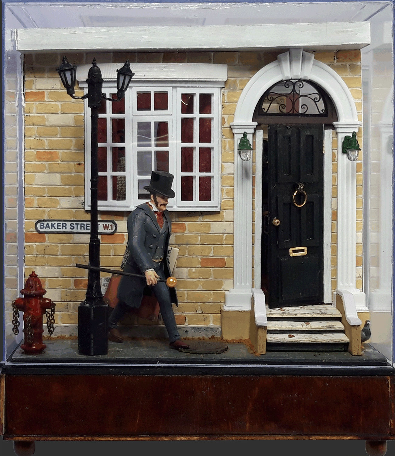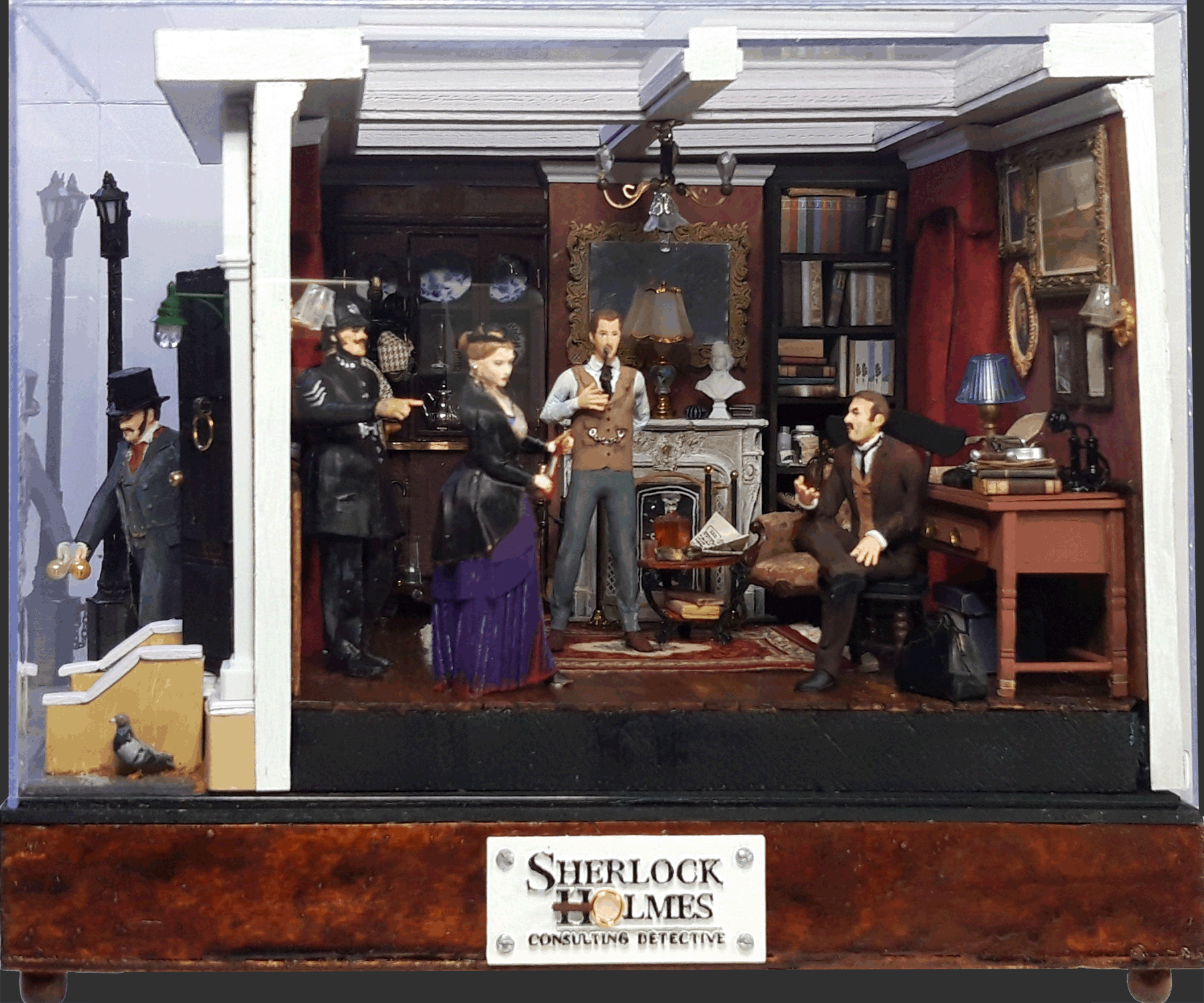 Sherlock HolmesScale: 1:18 Size (dust cover incl.) 30x21x24.5 cm (12"x8.3"x9.6") Box drawer contains batteries and music chip for easy access. The soundtrack can be easily switched to another of choice via USB cable. Contact me for more information.