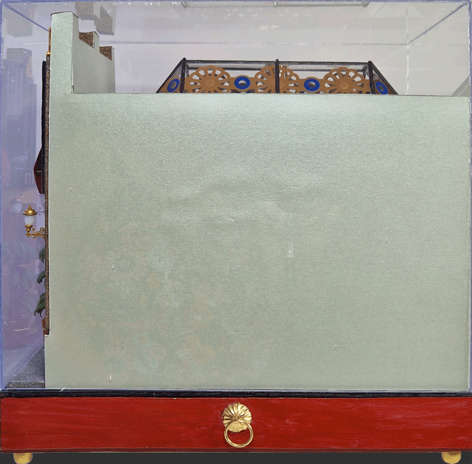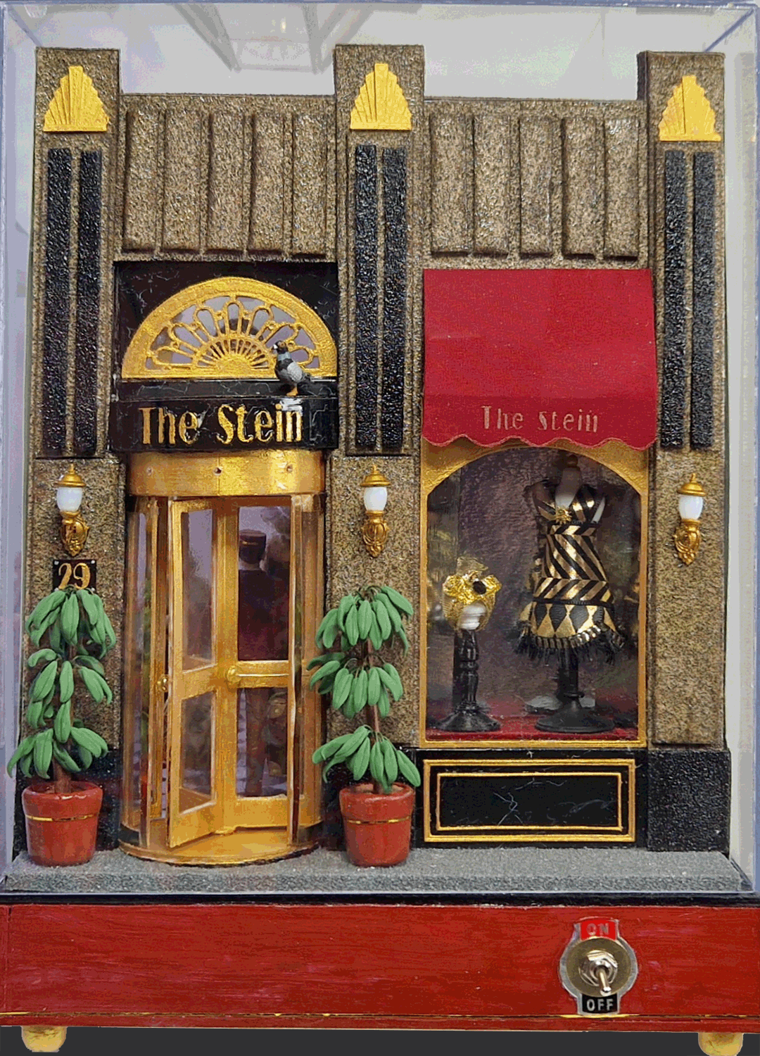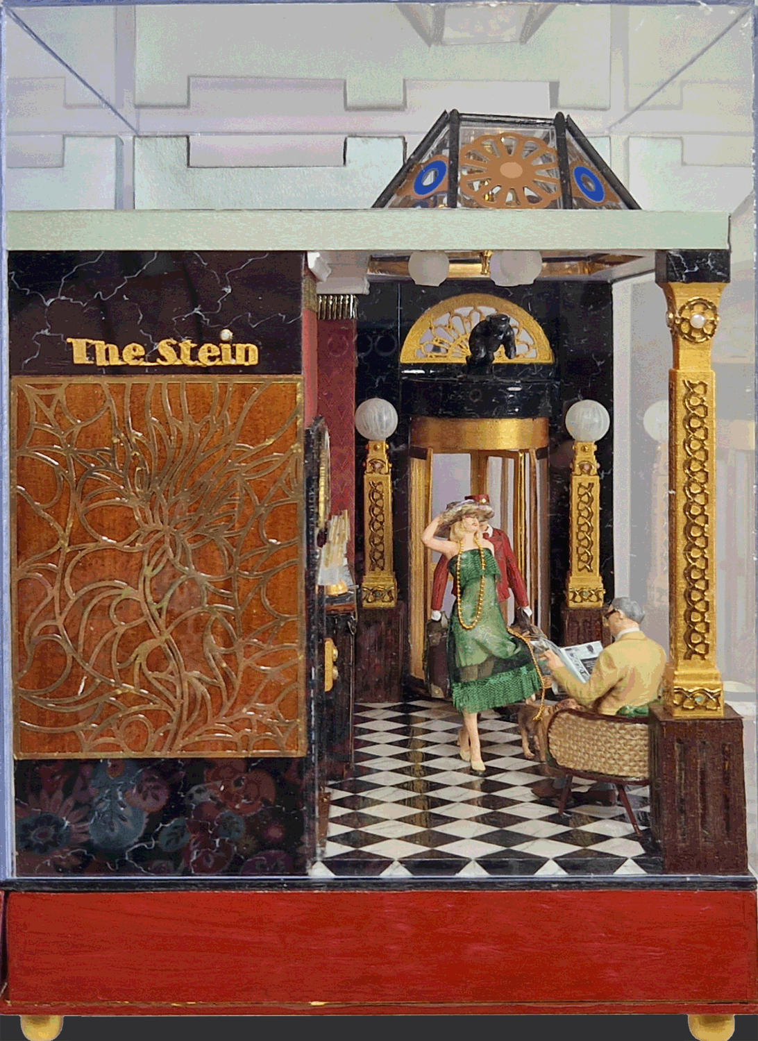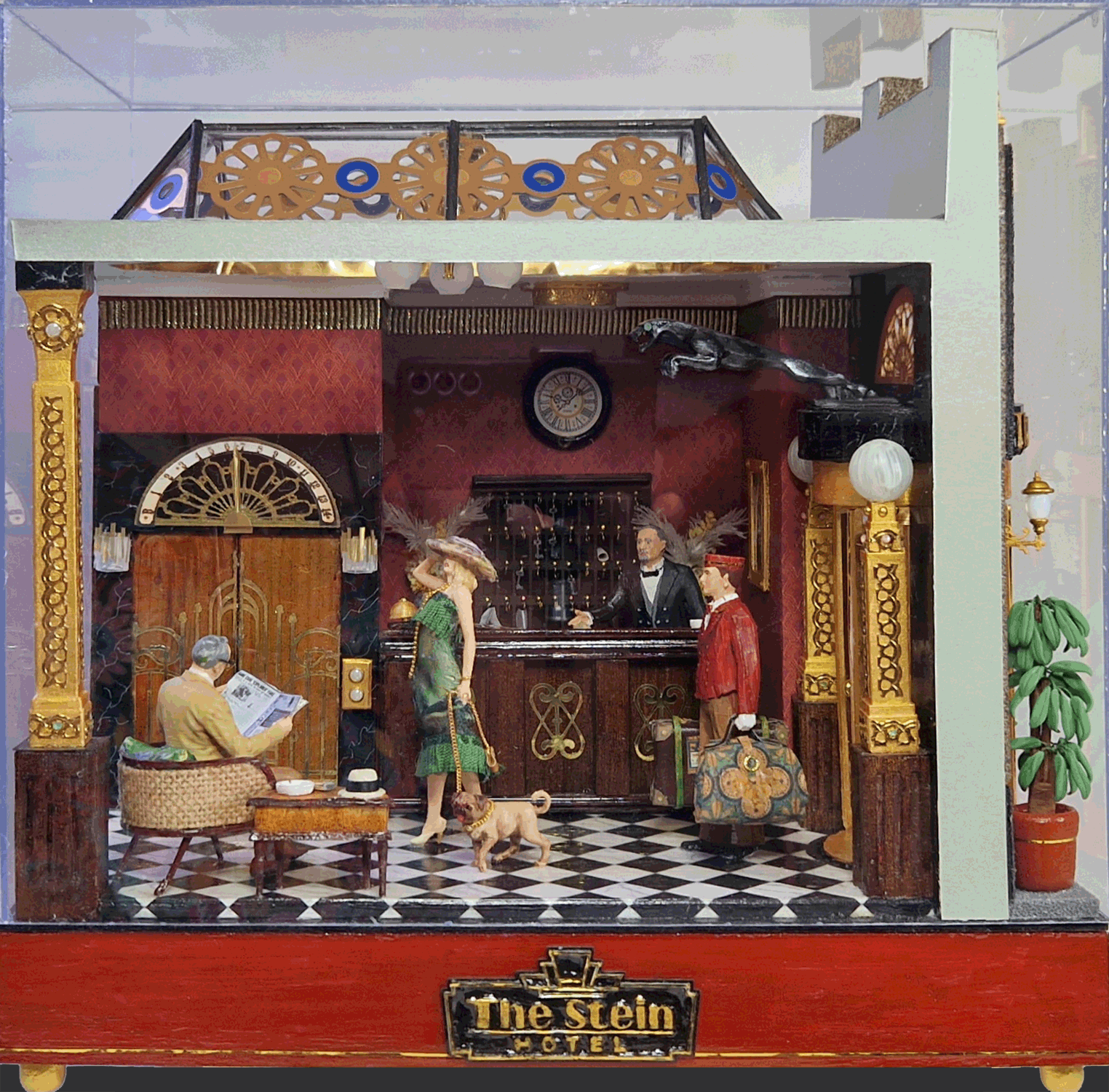 The Stein Hotel Scale: 1:20 Size (dust cover incl.) 30x21x30 cm (12"x8.3"x12") Box drawer contains batteries and music chip for easy access. The soundtrack can be easily switched to another of choice via USB cable. Contact me for more information.